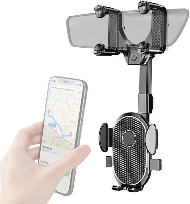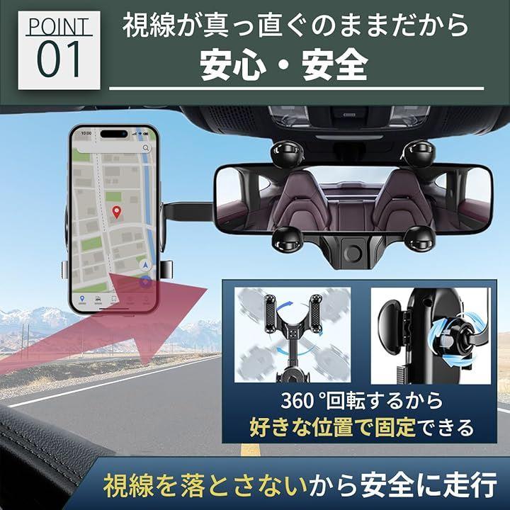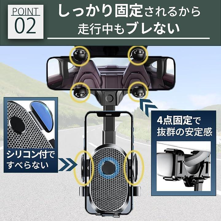 「安心の固定力」ルームミラーに取り付ける部分、回転アーム部分、スマホホールド部分のいずれもしっかりと固定することができ、運転中にズレることがありません。