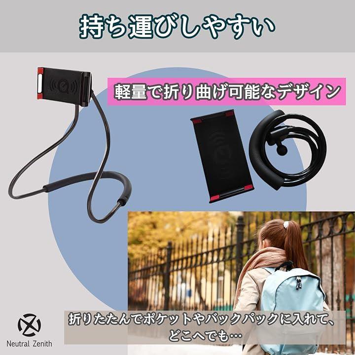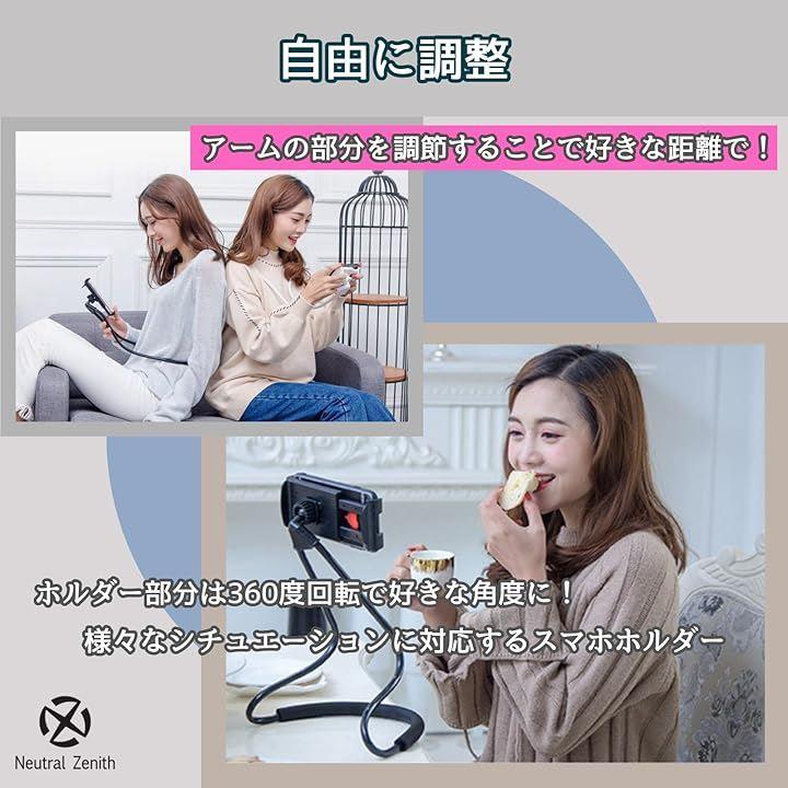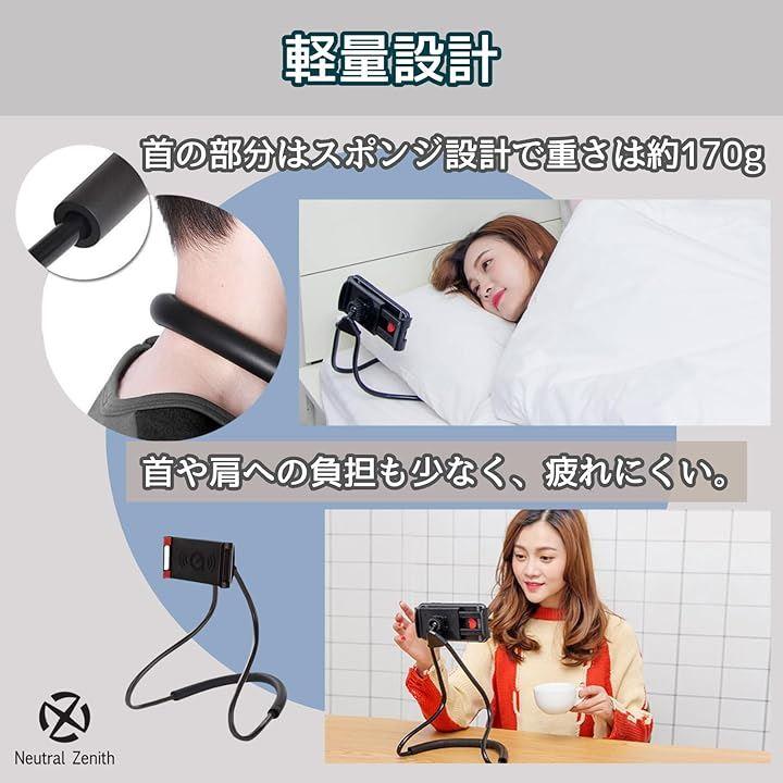 「軽量設計」アームの長さは約60cmあるためスマホが近すぎて見にくいということは無く、首の部分はスポンジ設計で重さは約170gと軽量なため、首や肩への負担も少なく、疲れにくいです。