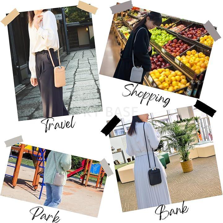 「機能的 スマホショルダーバッグ」 視認性の高い広い開口部を採用し、バッグの中身が一目でわかる設計。