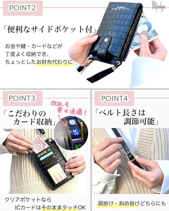 「お出掛けの必須アイテム」 スマホ専用ポケットに裏面カードポケット、サイドにはファスナーポケット。