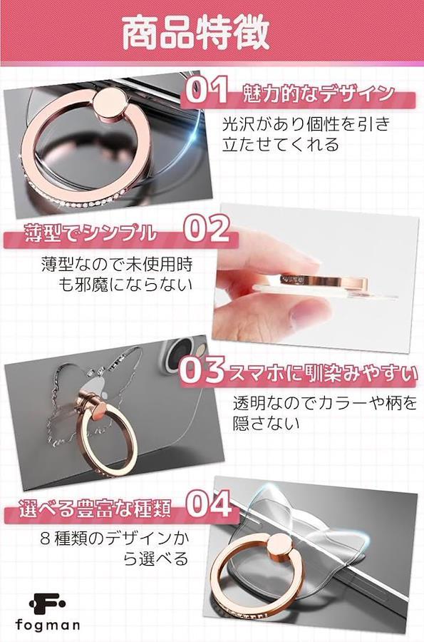 「商品特徴」(1)魅力的なデザイン:光沢があり個性を引き立たせてくれる/(2)薄型でシンプル:薄型なので未使用時も邪魔にならない/(3)スマホに馴染みやすい:透明なのでカラーや柄を隠さない/(4)選べる豊富な種類:8種類のデザインから選べる