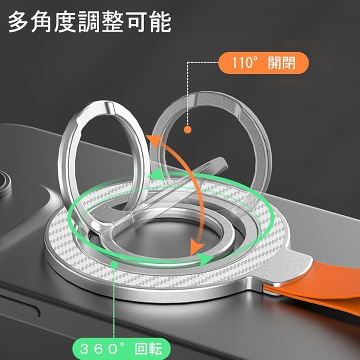 スマホを握るだけでなく、360度回転&110度角度調節可能なスマホスタンドとしても活用可能。