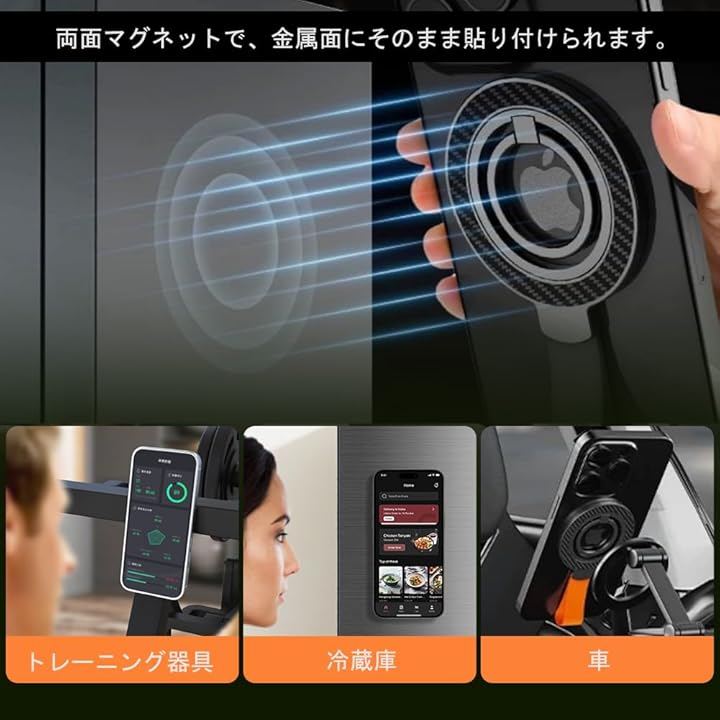 「両面マグネットで多様なシーン対応」 片面はMagSafe対応iPhone用、もう片面は強力マグネットで冷蔵庫や金属面に直接貼り付け可能。
