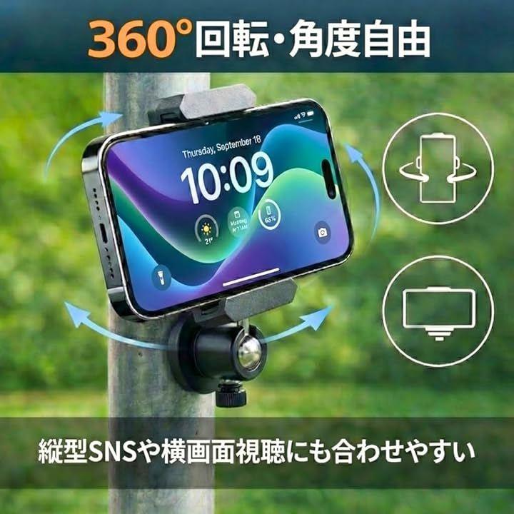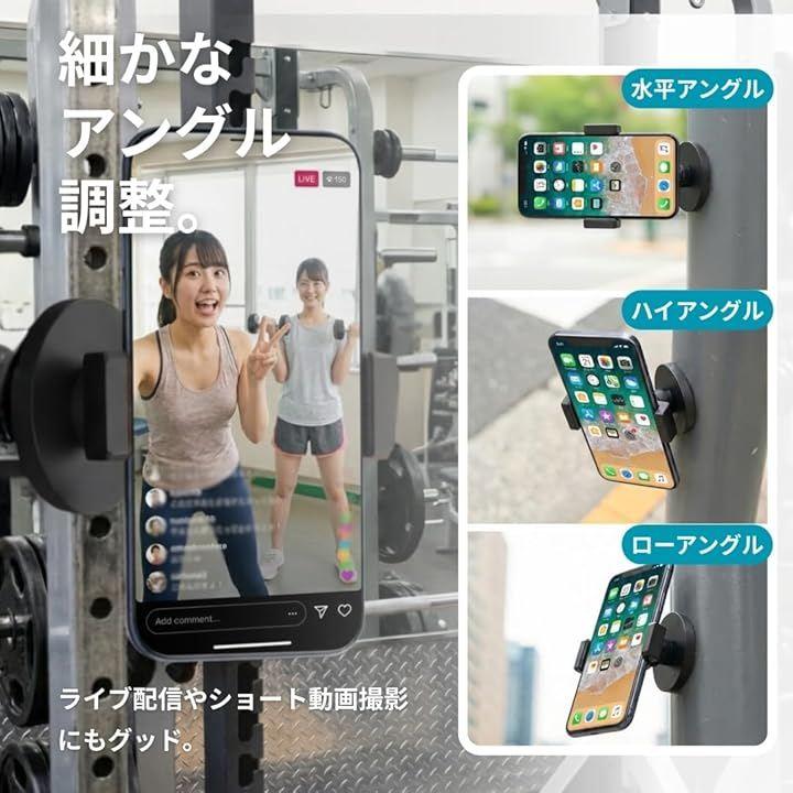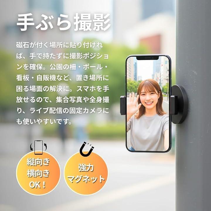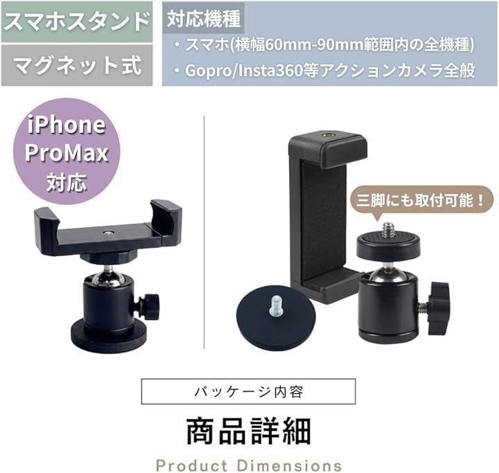 「商品内容」パッケージ内容:スマホ用クランプx1、アングル調整アダプターx1、マグネットx1 適合サイズ:横幅60mm-90mm範囲内の全機種 *サイズ詳細は商品画像をご確認ください。