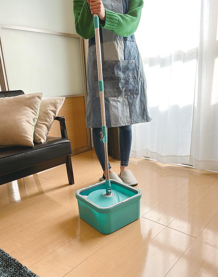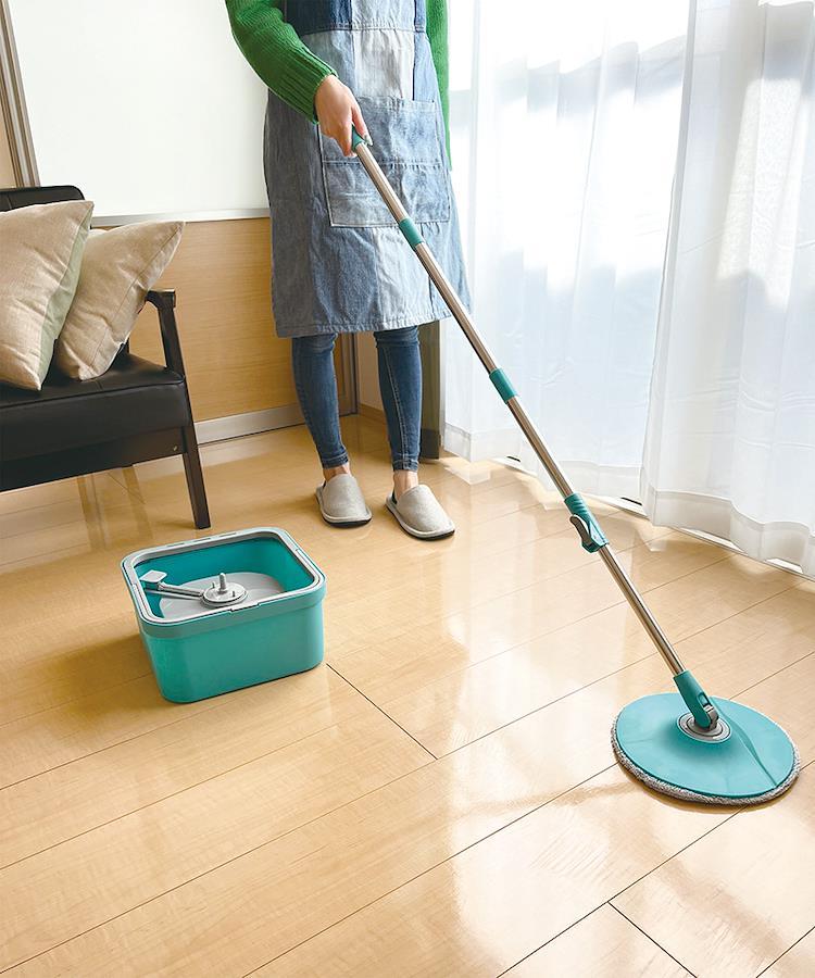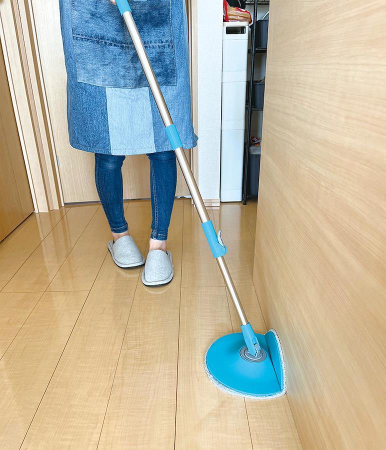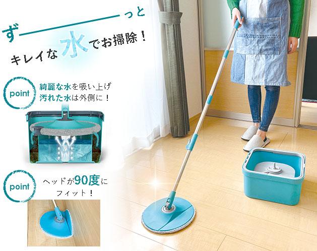 ★上下に押すだけ手洗い不要&簡単洗浄で綺麗なお水で掃除できる回転モップ!*水の入ったバケツにモップを差し込むと回転して水洗い!モップもずっと綺麗!*洗った後の汚れた水は自動で外側に、内側のキレイな水で常に洗えます。排水キャップを外して栓を抜くだけで排水簡単、ワンタッチで手も汚れません。*ヘッドが90度に曲がるので壁に沿ってモップ掛けできるだけでなく、隅までしっかりお掃除できます。*軽量で使いやすいモップは長さを変えることができるので女性も男性も使いやすい設計となっております。*替えモップはマイクロファイバーとナイロンを使用することにより、柔らかくて吸水性や耐摩耗性等にも優れて、何度も洗って使用が可能です。床や壁に優しく、特に木製の床面を傷つけずキレイに掃除できます。