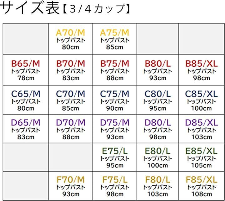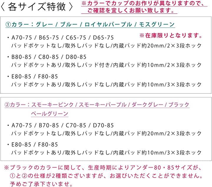 ・カラーはブラック・パープル・ブルー・グレー・ダークグレー・スモーキーパープル・スモーキーピンク・ペールグリーンの8色から、サイズはA70・A75・B65・B70・B75・B80・B85・C65・C70・C75・C80・C85・D65・D70・D75・D80・D85・E70・E75・E80・E85・F70・F75・F80・F85の25サイズからとなっております。