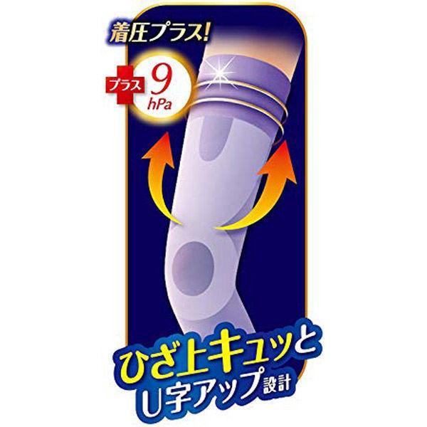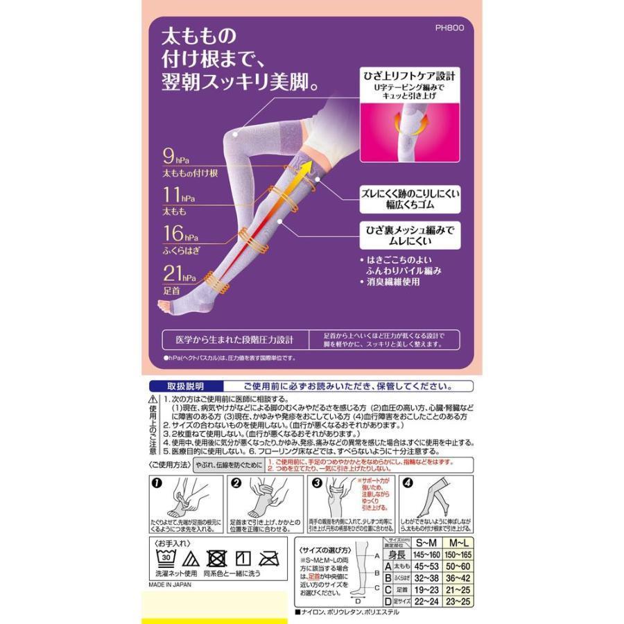 太ももの付け根まで、翌朝スッキリ美脚。●ひざ上リフトケア設計。U字テーピング編みでキュッと引き上げ。●ズレにくく跡のこりしにくい幅広くちゴム。●ひざ裏メッシュ編みでムレにくい。●はきごこちのよいふんわりパイル編み。●消臭繊維使用。●医学から生まれた段階圧力設計。足首から上へいくほど圧力が低くなる設計で脚を軽やかに、スッキリと美しく整えます。●M-Lサイズ。