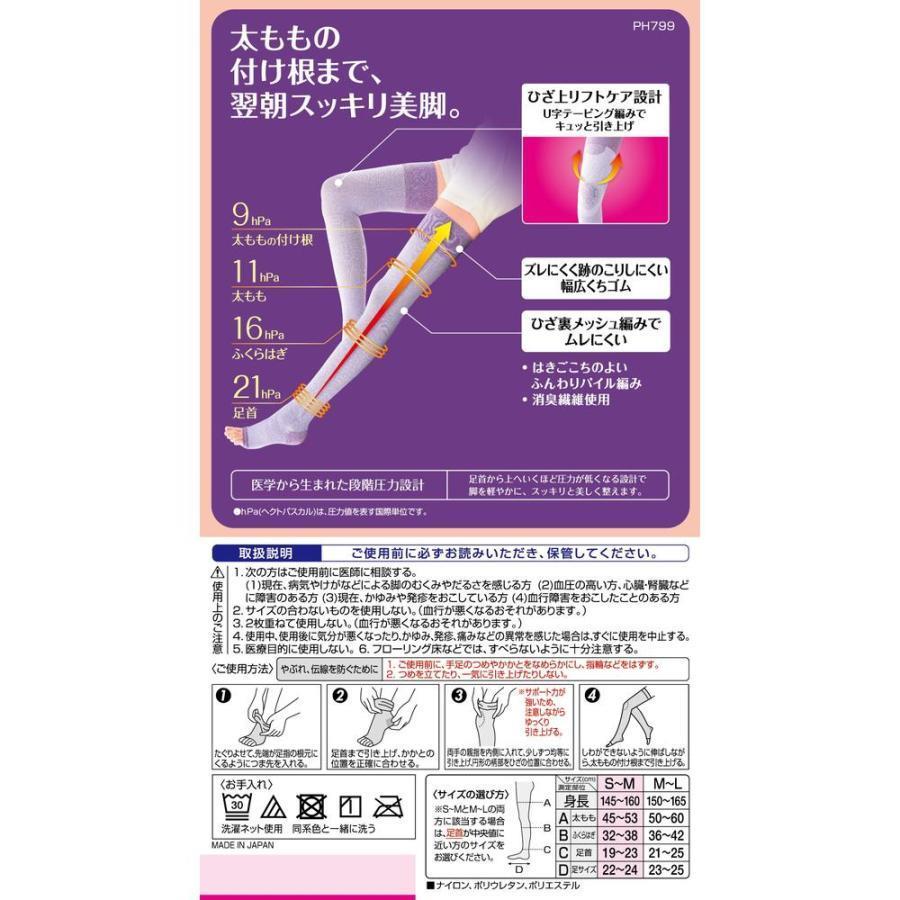 太ももの付け根まで、翌朝スッキリ美脚。●ひざ上リフトケア設計。U字テーピング編みでキュッと引き上げ。●ズレにくく跡のこりしにくい幅広くちゴム。●ひざ裏メッシュ編みでムレにくい。●はきごこちのよいふんわりパイル編み。●消臭繊維使用。●医学から生まれた段階圧力設計。足首から上へいくほど圧力が低くなる設計で脚を軽やかに、スッキリと美しく整えます。●S-Mサイズ。