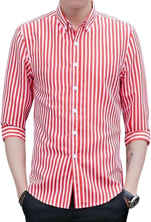 Men's slim-fit striped shirt with three-quarter sleeves, collar, button-down, polyester, non-iron, lightweight, and pockets