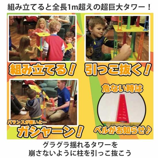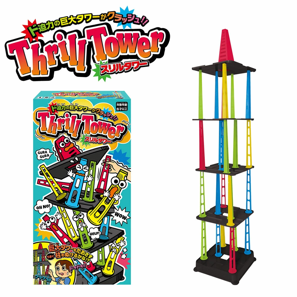 【商品名/型番】スリルタワー / 4977513083904【セット内容】●タワー台…1個 ●フロア…4個 ●柱…合計24本(赤 黄 緑 青) ベルタワー…1個 スピナー…1個【商品サイズ】W270×H510×D110mm【材質】ABS,PS,PP,鉄,紙【対象年齢】6才以上【商品情報】組み立てると全長1m超えの超巨大タワーが登場!グラグラ揺れるタワー崩さないように柱を引っこ抜くゲームです。ルーレットを回し、出た色と同じ色の柱を引っこ抜きます。無事に引っこ抜けたらポイントゲット!柱の色によって難易度が変わり、ポイントも変わります。崩した人はポイントがゼロになってしまいます。タワーの頂上に置いた赤い三角のベルは、タワーが揺れるたびにリンリンなって危険をお知らせします。ビッグタワーの迫力は動画映え間違いなし!ルールも単純なので家族で…お友達と…大人同士でも楽しめます!