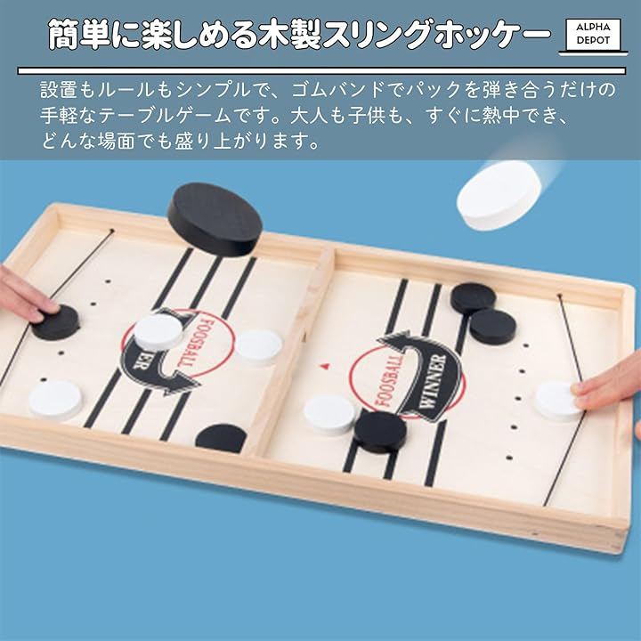 「簡単に楽しめる木製スリングホッケー」設置もルールもシンプルで、ゴムバンドでパックを弾き合うだけの手軽なテーブルゲームです。