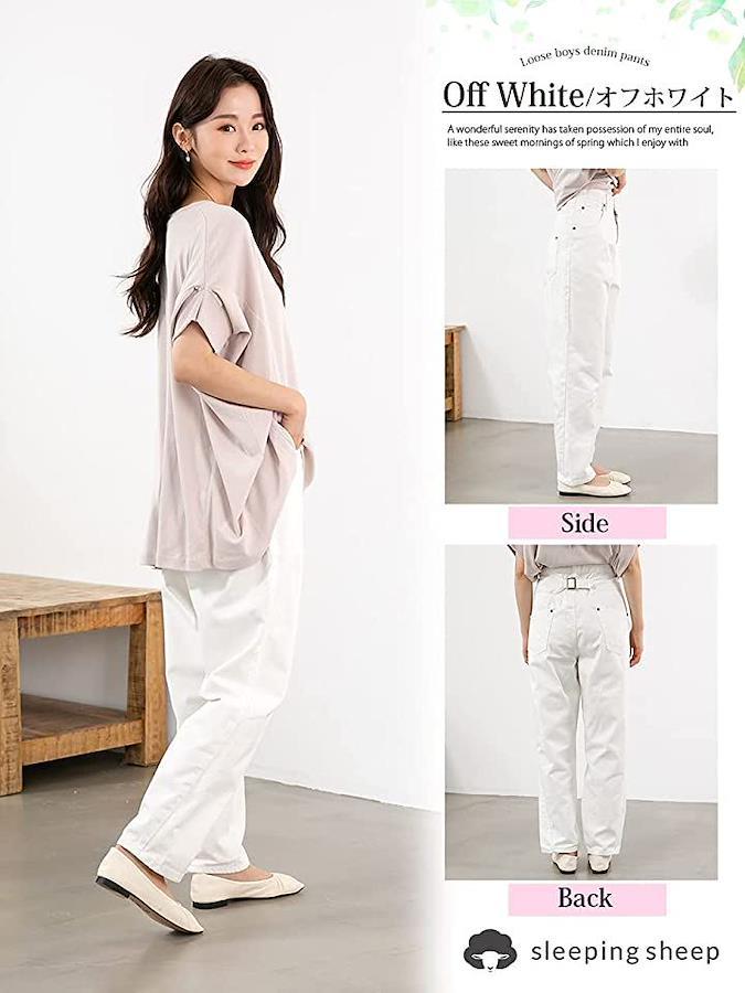 ・裾をまくり上げてロールアップ風の着こなしをすれば、足首をキュッと華奢に見せて着やせ効果も期待できます。