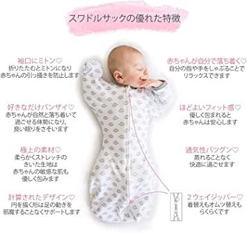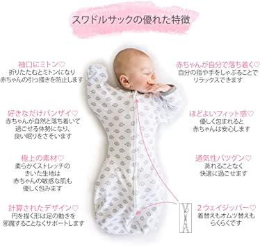 アメリカで数々の賞を受賞! パパ・ママのお気に入りベビー用品として選ばれています。【2サイズ】S:0-3か月 2.7kg-5.5kg M:3-6か月 5.5kg-9.5kg【プレミアムコットンニット素材】コットン100%だから柔らかく伸縮性高く通気性もあり! 赤ちゃんの敏感な肌も優しく包みます。【ひっかき防止対策に】袖口折りたたむとミトンとなり、赤ちゃんの引っ掻きを防止します。【好きなだけバンザイ】赤ちゃんが自然と落ち着いて過ごせる体勢になり、良い眠りを誘います。【オムツ交換もラクラク】着脱しやすい2wayジッパー付きで、上下どちらからでも開け閉め可能! 赤ちゃんを暖かく包んだままオムツ交換できます。