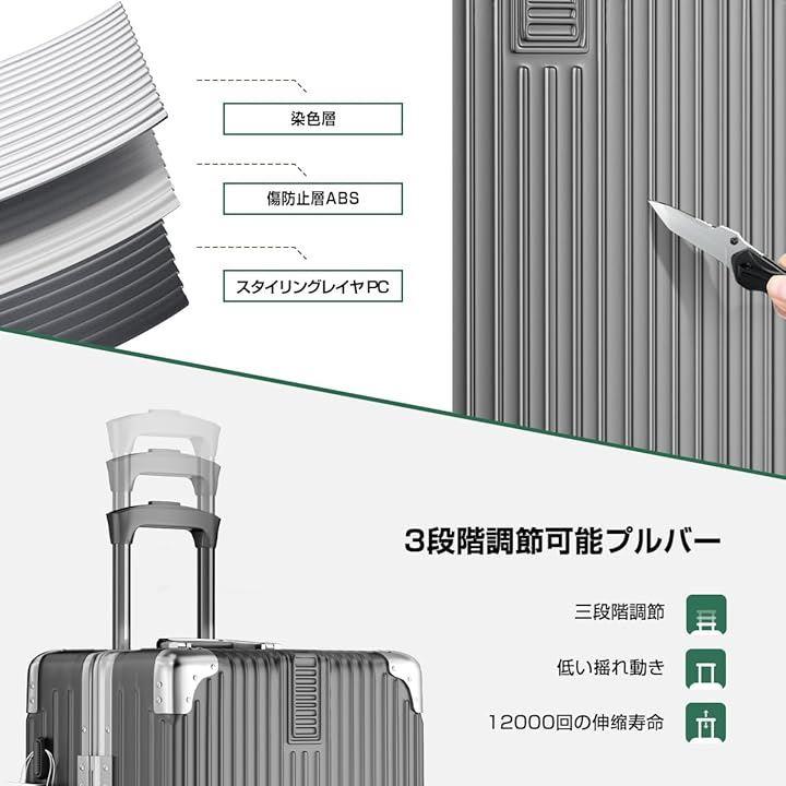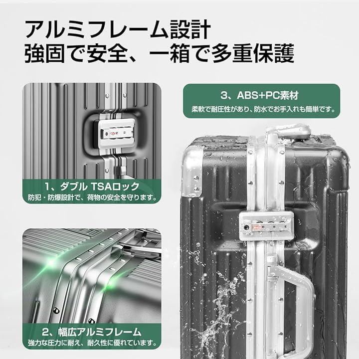 「高品質アルミフレーム&360°静音キャスター」 このスーツケースは、軽量で耐裂性のあるABS樹脂と衝撃に強いPC樹脂を組み合わせた素材に、幅広のアルミフレームデザインを採用し、頑丈で耐久性のあるハードシェルを実現しました。