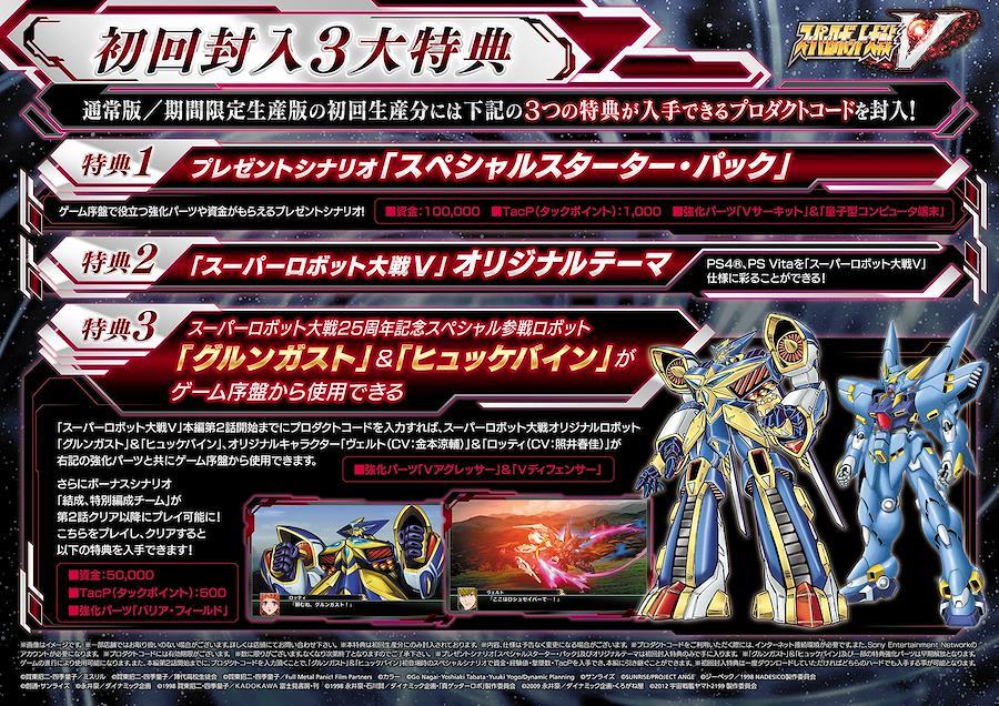 初回封入3大特典に関してスーパーロボット大戦25周年記念「初回封入3大特典」 通常版/限定版の初回生産分には「初回封入3大特典」を入手できるプロダクトコードを同梱! 特典1プレゼントシナリオ「スペシャルスターター・パック」 特典2スーパーロボット大戦V「オリジナルテーマ」 特典3スーパーロボット大戦25周年記念スペシャル参戦ロボット「グルンガスト」&「ヒュッケバイン」がゲーム序盤から使用できる
