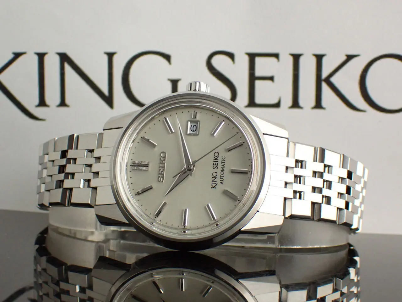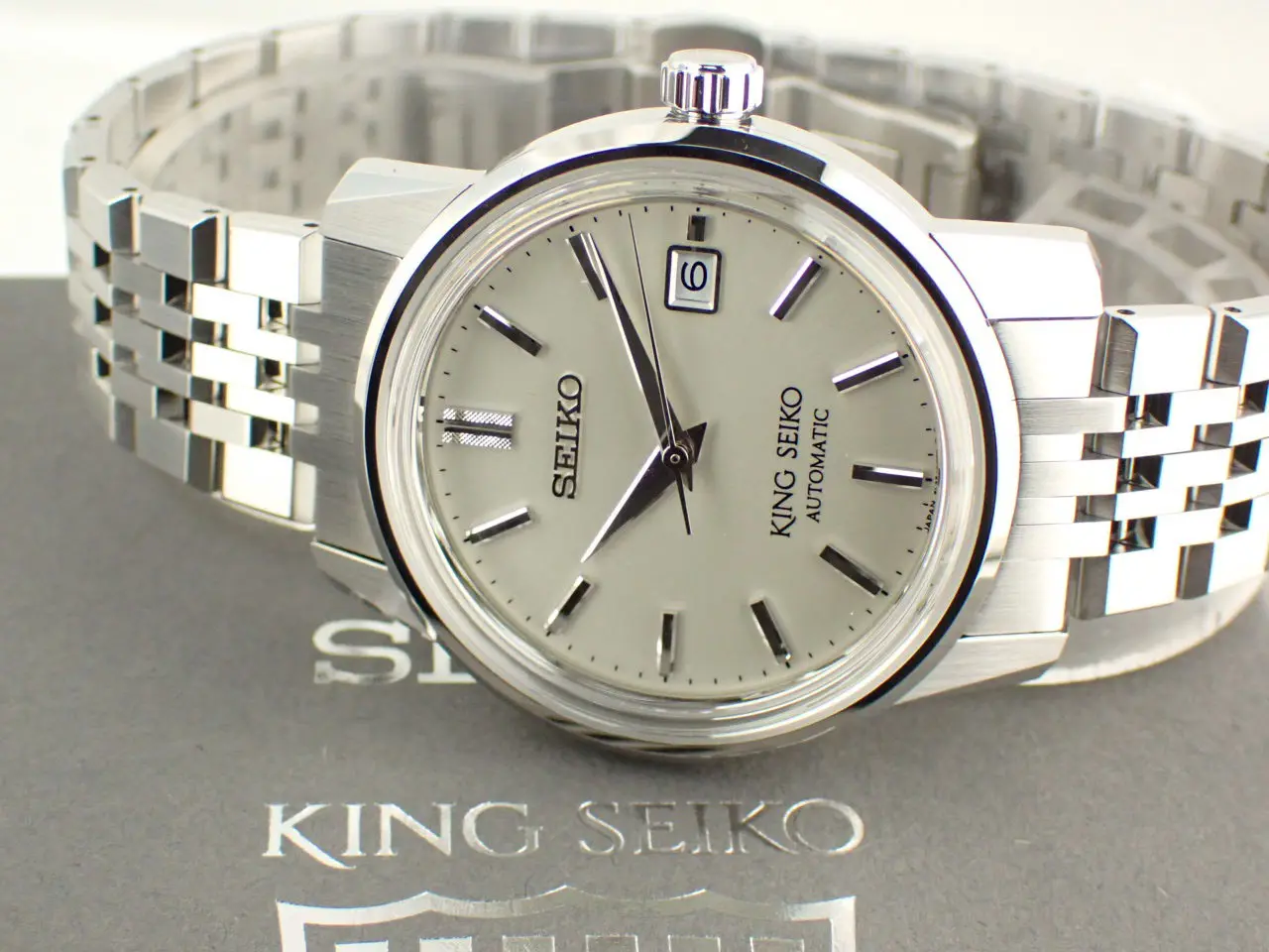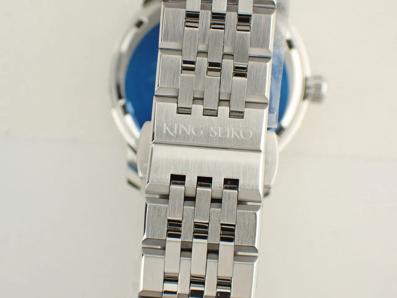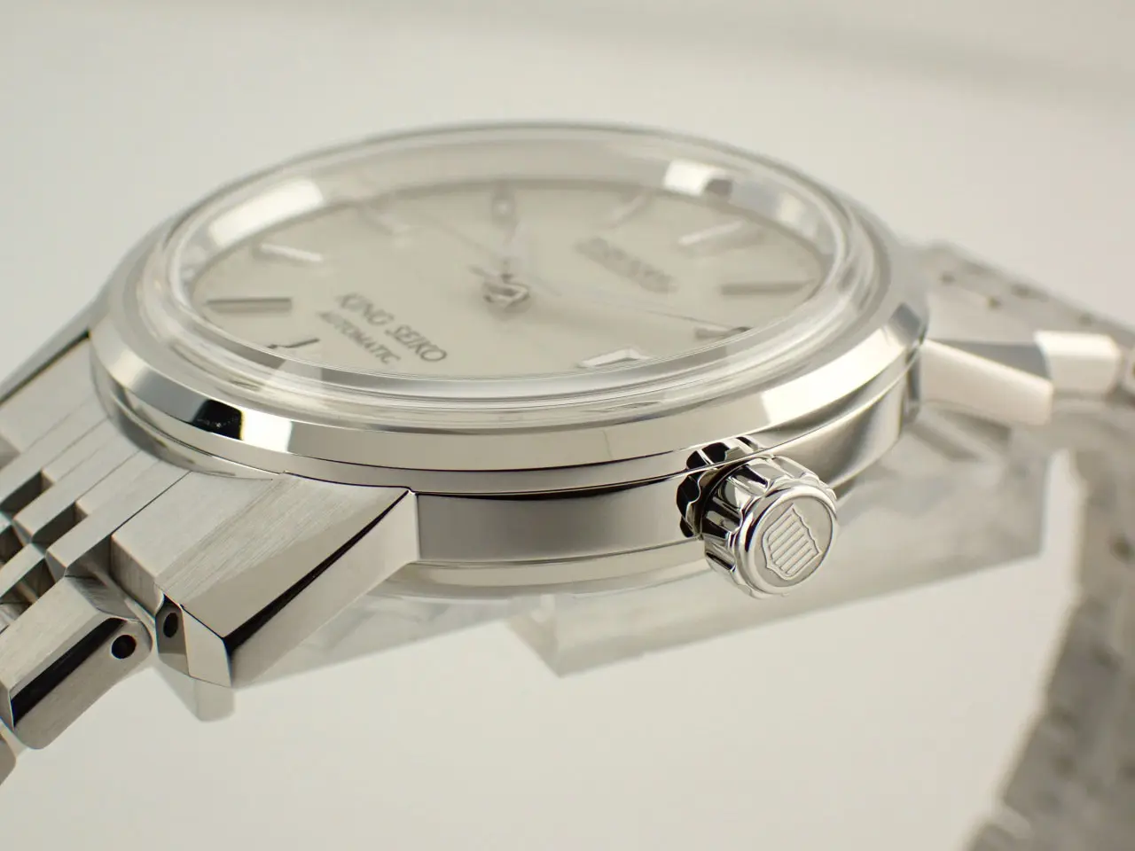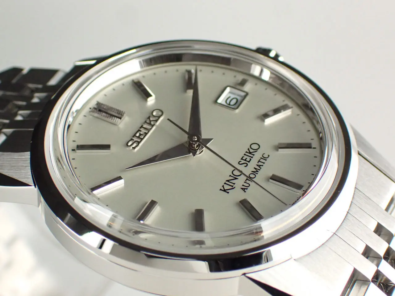 こちらは、ハイエンドコレクション「キングセイコー」。ダイヤルはヴィンテージ感のあるややくすんだシルバーカラーにサンレイ仕上げが施され、放射状に輝きます。キングセイコーに特徴的な12時位置のインデックスはライターカットと呼ばれ、多面的に光を捉えて高級感と視認性を両立させています。少しレトロな7連ブレスもよいアクセントに。
