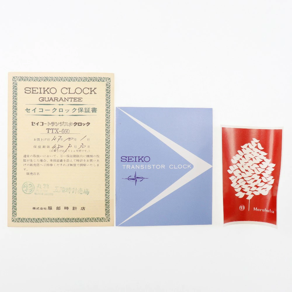 長期保管、未使用品。電池を入れて、今は時間も正常に動作していますが50年以上前に購入されたものですので、保証は出来かねます。付属の乾電池も古いためご使用は出来ません。某会社の竣工の記念品で、時計の裏に「新社屋竣工記念 株式会社〇〇」と記載がございます。ご理解の上ご購入をお願い致します。