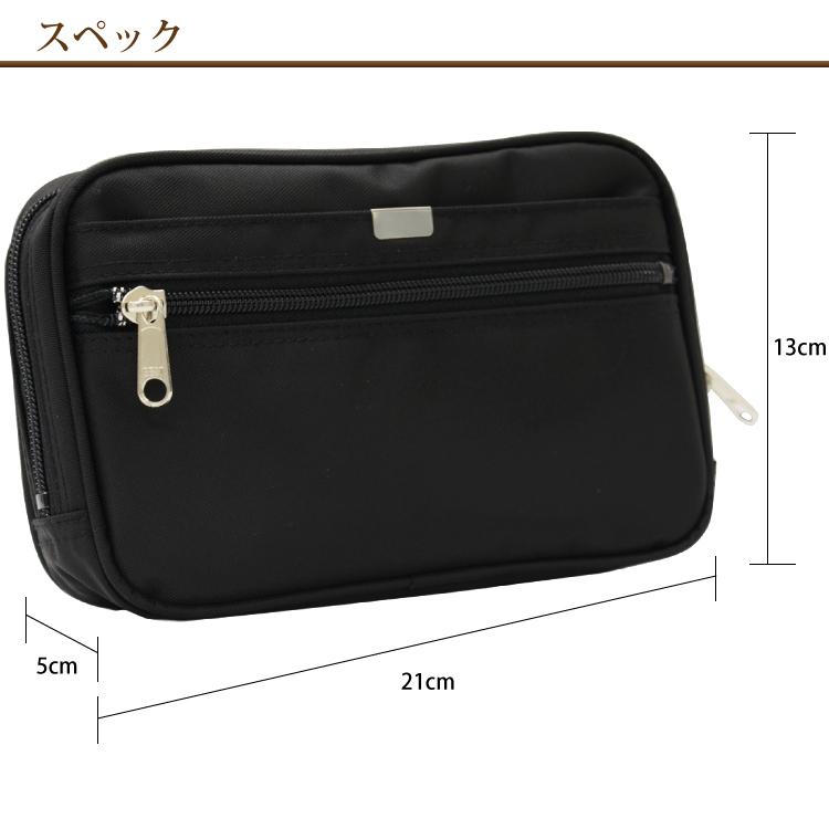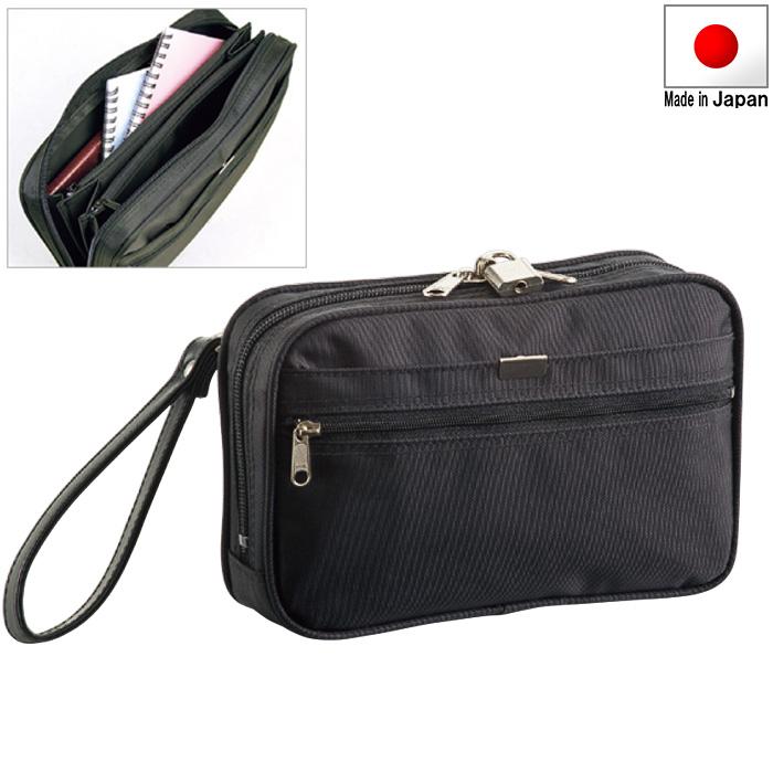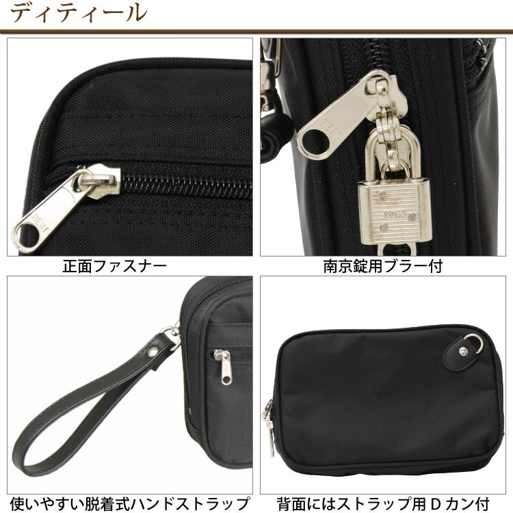 バッグインフォメーション●サイズ:横幅21×高さ13×厚み5(センチ)●素 材:ダッフルナイロン●カラー:(01)クロ●本体内部:2仕切り(ファスナー付)●前ポケット:2段ポケット(上段:ホック付アテポケット、下段:ファスナー付アテポケット)●脱着式ハンドストラップ●南京錠付●重 量:約200g●生産国:日本
