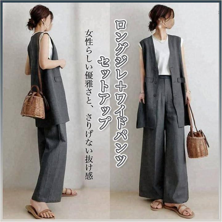 ロングジレとストレートパンツのセットアップは、シンプルながらも存在感があります。