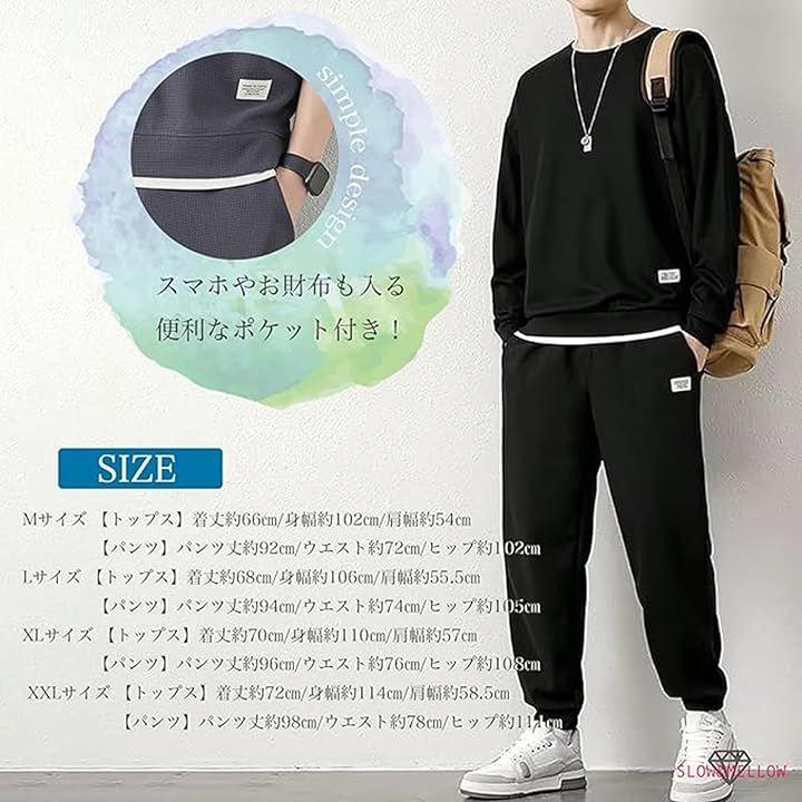 「サイズ」Mサイズ 「トップス」着丈約66cm/身幅約102cm/肩幅約54cm 「パンツ」パンツ丈約92cm/ウエスト約72cm/ヒップ約102cm Lサイズ 「トップス」着丈約68cm/身幅約106cm/肩幅約55.5cm 「パンツ」パンツ丈約94cm/ウエスト約74cm/ヒップ約105cm XLサイズ 「トップス」着丈約70cm/身幅約110cm/肩幅約57cm 「パンツ」パンツ丈約96cm/ウエスト約76cm/ヒップ約108cm XXLサイズ 「トップス」着丈約72cm/身幅約114cm/肩幅約58.5cm 「パンツ」パンツ丈約98cm/ウエスト約78cm/ヒップ約111cm