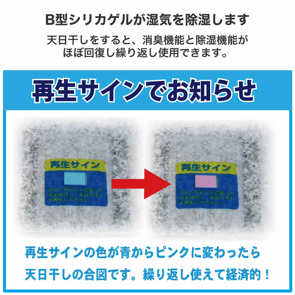 【商品情報】●旭化成セミア® が下駄箱の嫌な臭いの主成分であるイソ吉草酸を2時間で約98%除去して強力消臭します。(カケンテストセンターの試験結果より)●B型シリカゲルが下駄箱の湿気を除湿します。●天日干し(5時間以上)をすると、消臭機能と除湿機能がほぼ回復し繰り返し使用できます。●再生サインシールの色がブルーからピンクに変わったら天日干しの時期です。●下駄箱のサイズに合わせてハサミでカットできます。●企画・製造・検品まで国内自社工場で行う信頼の日本製。