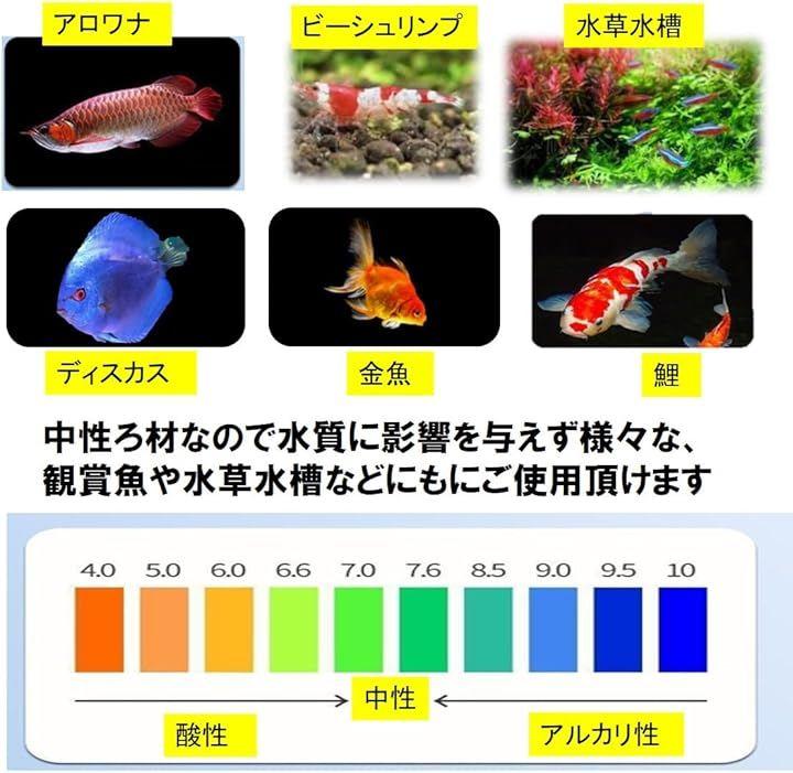 「水質に影響を与えない中性素材&幅広い魚種に対応」 pHを変動させにくい中性素材を使用しているため、デリケートな熱帯魚、金魚、メダカ、シュリンプ、さらには水草水槽まで、あらゆる環境で安心してご使用いただけます。