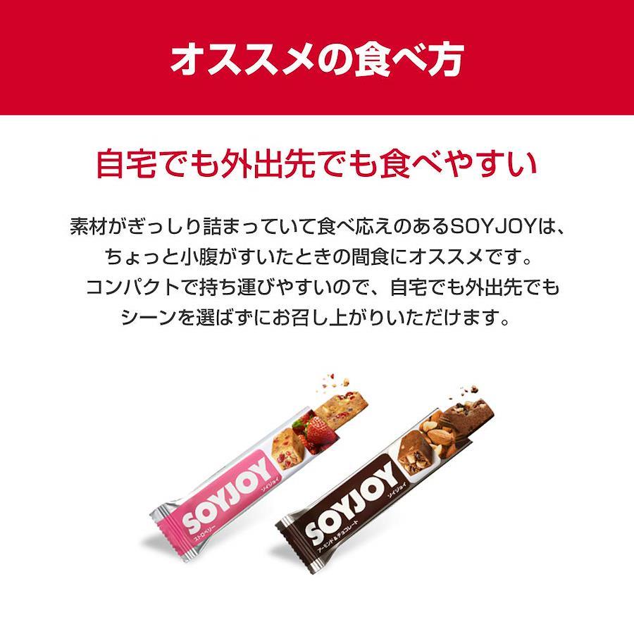SOYJOYは、小麦粉を使用せず大豆を粉にした生地にたっぷりのフルーツやナッツ、チョコレートを加えて焼き上げた新しいタイプの栄養食品です。大豆とフルーツやナッツ、チョコレートがぎっしり詰まっていてこぼれおちにくく大豆タンパク質やイソフラボン、ミネラルなど、素材由来の栄養素をおいしくスマートに摂る事ができます。さらに、糖質の吸収がおだやかで、太りにくいと言われている「低GI食品」です。大豆をまるごと粉にして生地に使用。(うすかわを除く)2種の味わいの異なるアップルたっぷり