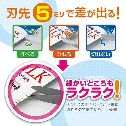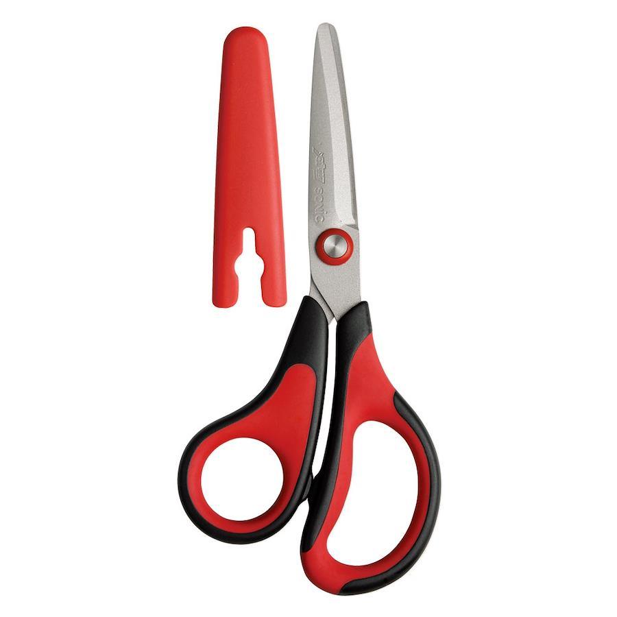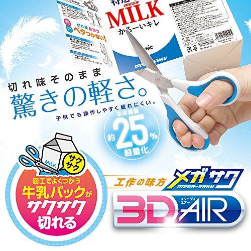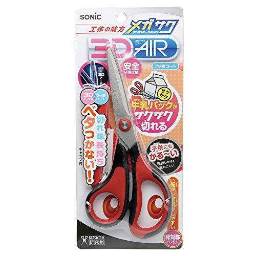 【子供の工作に最適の、切れ味と使い心地のよいハサミ】図工でよく使う牛乳パックが、サクサク切れるはさみです。「メガサク」シリーズ自慢の切れ味はそのままに、本体重量を約25%も軽量化しました。より軽い使い心地で細かい作業にも最適です。切り初めが滑りにくく、パワフルな切れ味です。2つ折りの牛乳パックを正確に切れるので、細工切りにも最適!!操作性も抜群!! 手にフィットする非対称ハンドルを採用したほか、刃に角度をつけて、切ったものが手に当たらないよう工夫しています。フッ素コートを施した3Dアーチ刃を使用しています。3Dアーチ刃の曲面設計で、テープなどののりが付きにくく、フッ素コートがベタつき・汚れ・サビなどから刃を保護します。刃が擦れないので、フッ素コートも長持ち!!小さなお子様にも安心の設計。キャップつきで、刃先は丸くなっています。ソニックの工作用ハサミ「メガサク3Dエアー」は、右利き用と左利き用を展開。カラーは、右利き用がレッド、ブルー、ピンクの3色。左利き用はイエローです。商品名:ソニック はさみ メガサク3Dエアー 学童はさみ レッド SK-5247-R こどもの工作用の、牛乳パックもサクサク切れるハサミです。 フッ素コートを施した3Dアーチ刃で、ベタつかず切れ味も長持ちします。 【サイズ】W70xH150xD10mm 【カラー】レッド 【材質】刃=ステンレス鋼、グリップ=PP