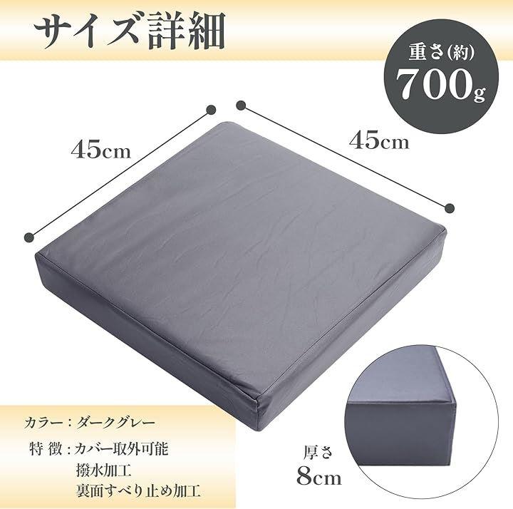 「商品仕様」 ・サイズ:45cm x 45cm x 8cm ・カラー:ダークグレー ・素材:高反発スポンジ、ポリエステル生地 ・用途:ソファクッション、椅子用クッション、床座用、インテリアアクセント