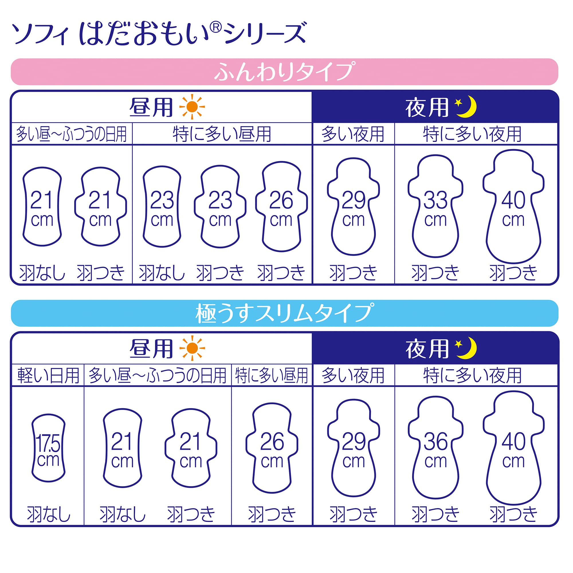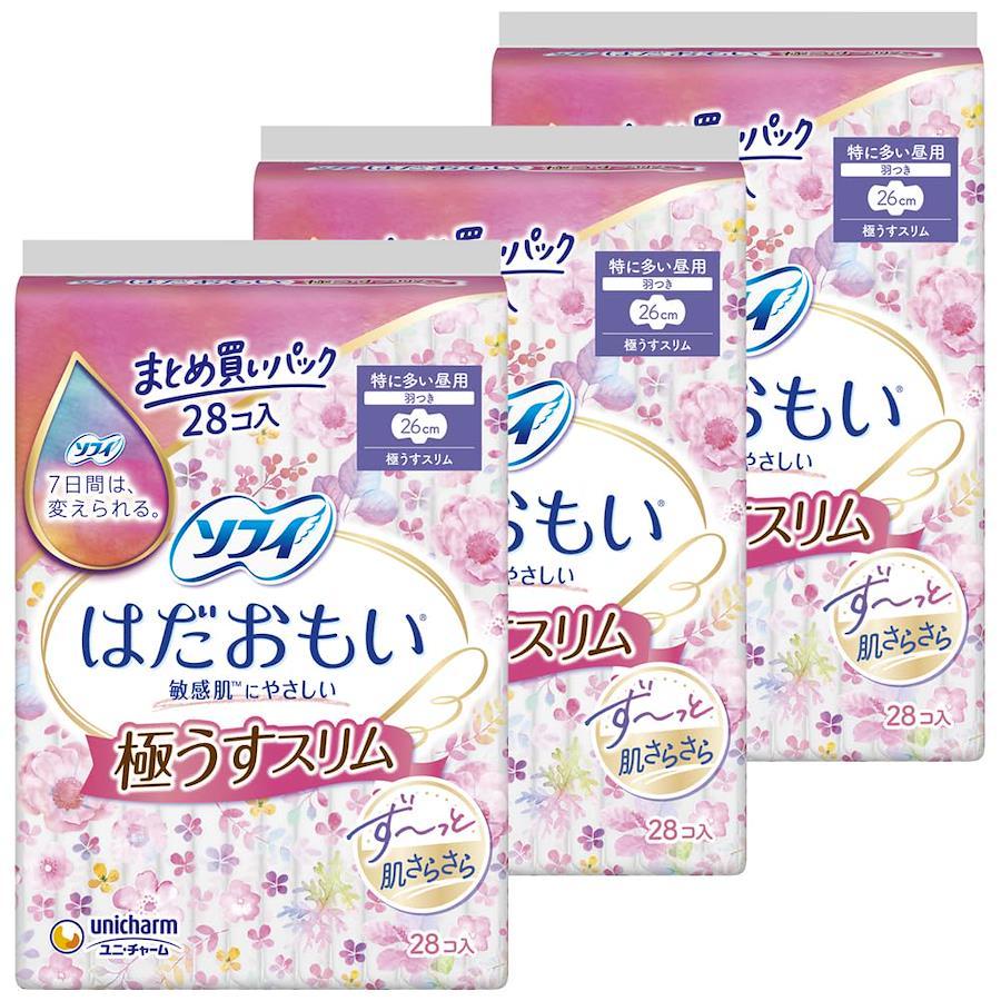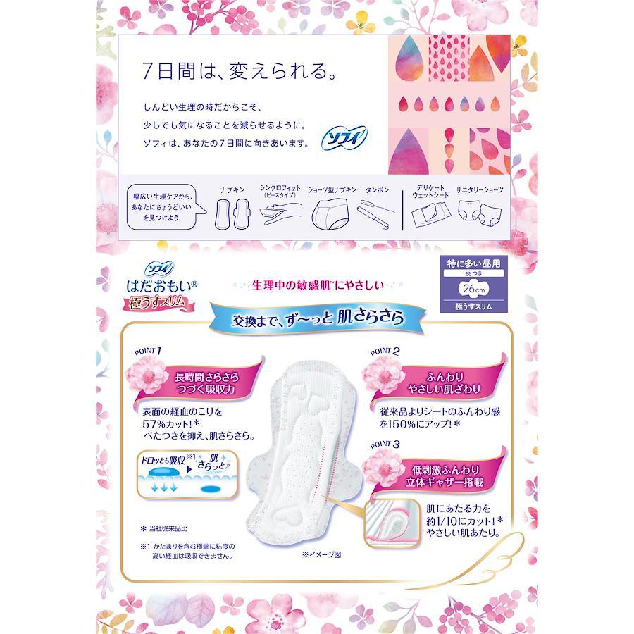ドロッと経血分散吸収シートが、今までは吸収しづらかった年度の高い経血分も分散させて、すっと吸収。だから表面のサラサラが続き、肌を清潔に保ちます。なめらかなシートでやわらかい肌ざわり。 生理中の敏感肌にやさしい、はだおもい極うすスリム 「すっぴん肌シート」搭載で、シートのふんわり感150%にアップ※。肌こすれも抑え、快適なつけ心地がつづきます。 ※当社製品比 「低刺激ふんわり立体ギャザー」搭載で、肌にあたる力を約1/10※にカット! やさしい肌あたりがつづきます。 ※当社製品比 羽つき 26cm 商品サイズ(幅×奥行×高さ):153mm×101mm×200mm 内容量:28枚 パッケージのデザイン変更に伴い、掲載画像とは異なったデザインの商品が届く場合がございます。あらかじめご了承ください。 原産国:日本