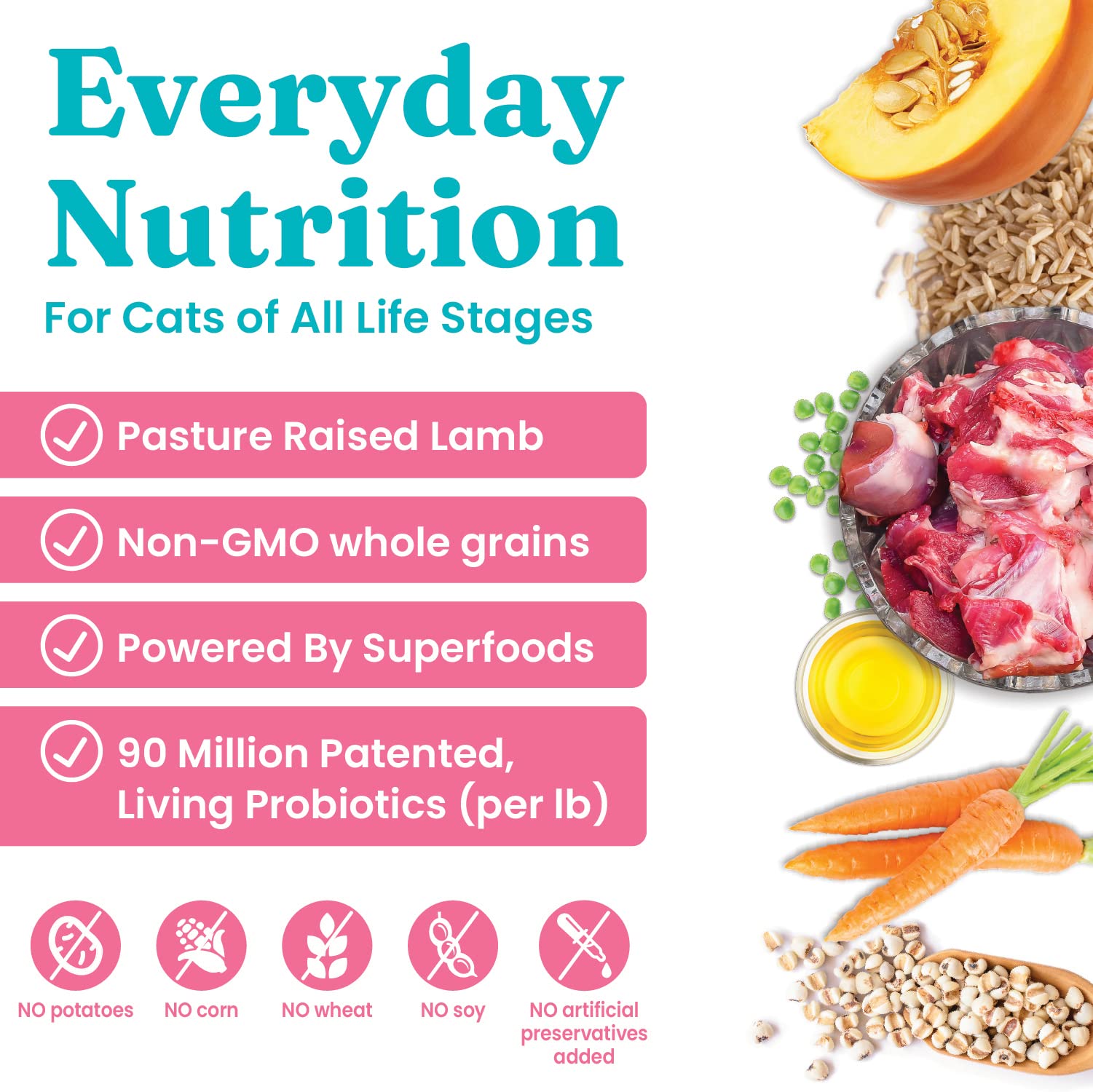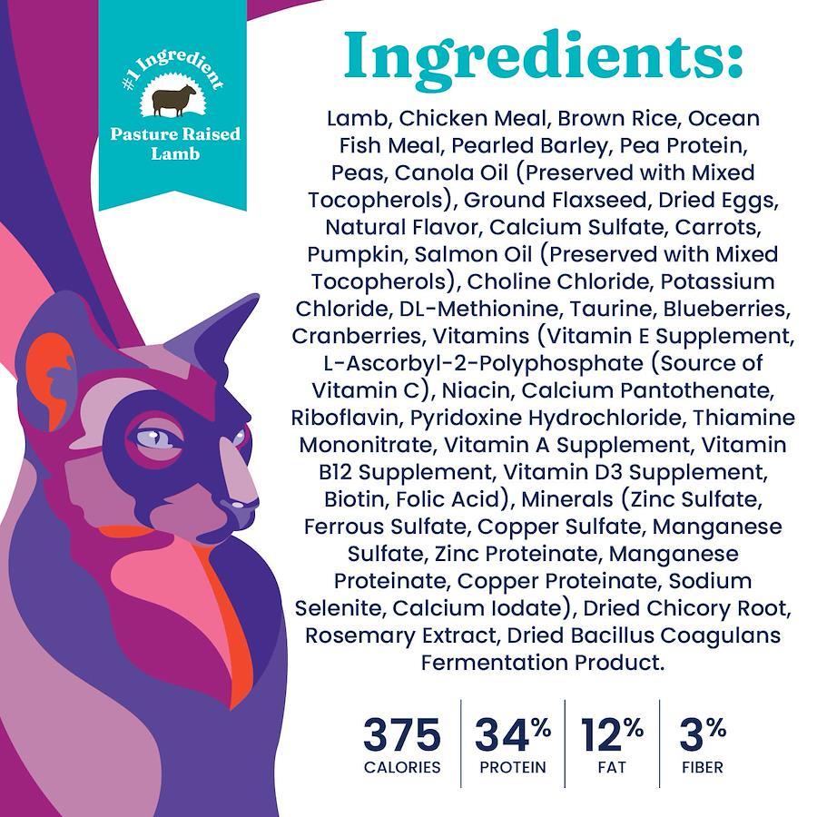 ラム、チキンミール、玄米、オーシャンフィッシュミール、脱穀大麦、エンドウタンパク質、エンドウ豆、キャノーラ油、亜麻仁、乾燥卵、天然香料、硫酸カルシウム、ニンジン、カボチャ、サーモンオイル、塩化コリン、塩化カリウム、DL-メチオニン、タウリン、ブルーベリー、クランベリー、ビタミン類(ビタミンE、L-アスコルビン酸-2-ポリリン酸、ナイアシン、パントテン酸カルシウム、リボフラビン、塩酸ピリドキシン、チアミン硝酸塩、ビタミンA、ビタミンB12、ビタミンD3、ビオチン、葉酸)、ミネラル類(硫酸亜鉛、硫酸鉄(Ⅰ)、硫酸銅、硫酸マンガン、亜鉛タンパク質化合物、マンガンタンパク質化合物、銅タンパク質化合物、亜セレン酸ナトリウム、ヨウ素酸カルシウム)、乾燥チコリー根、ローズマリーエキス、乾燥バチルスコアグランス発酵物