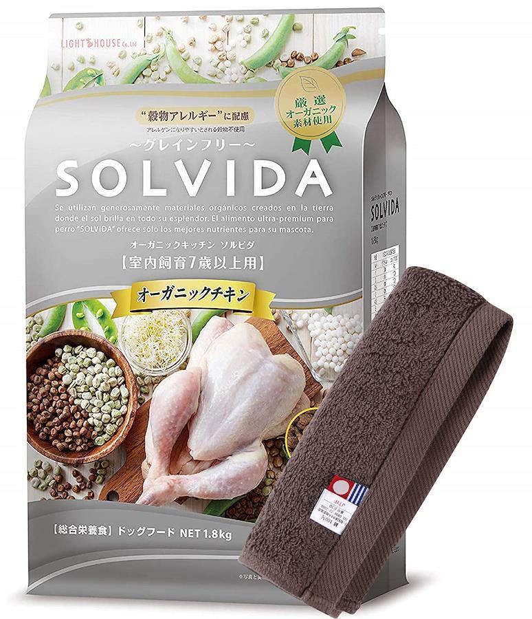 グレインフリーのプレミアムドッグフード ソルビダは、今まで以上に原材料にこだわりました。本来は肉食動物であるワンちゃんの為に全シリーズの原材料をグレインフリー(穀物不使用)とし、食物アレルギーを心配されているワンちゃんにも安心して与えていただけるようにしました。 ●ワンちゃんにいつまでも元気でいて欲しいから、ソルビダは食材、栄養バランス、安全性にこだわりました。 素材そのもののおいしさを生かしているので、ドライフードが苦手なワンちゃんでも、食事の時間が楽しみになる抜群の嗜好性です。 ●毎日一生食べるものだから、安全性にとことんこだわり、主原料にオーガニック食材を使用しました。 ●こちらの商品は犬想いオリジナル今治ハンドタオルセット、カラーモカになっています。