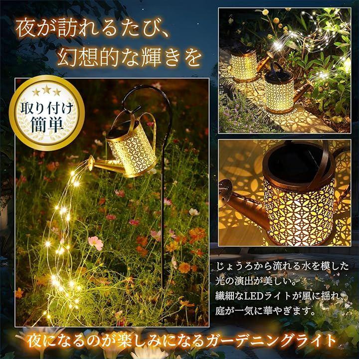 幻想的な光で庭をおとぎ話の世界に まるで星屑が流れ落ちるように輝くソーラーガーデンライトは、じょうろからあふれる光が花や芝生を包み込み、おとぎ話のような雰囲気を演出します。