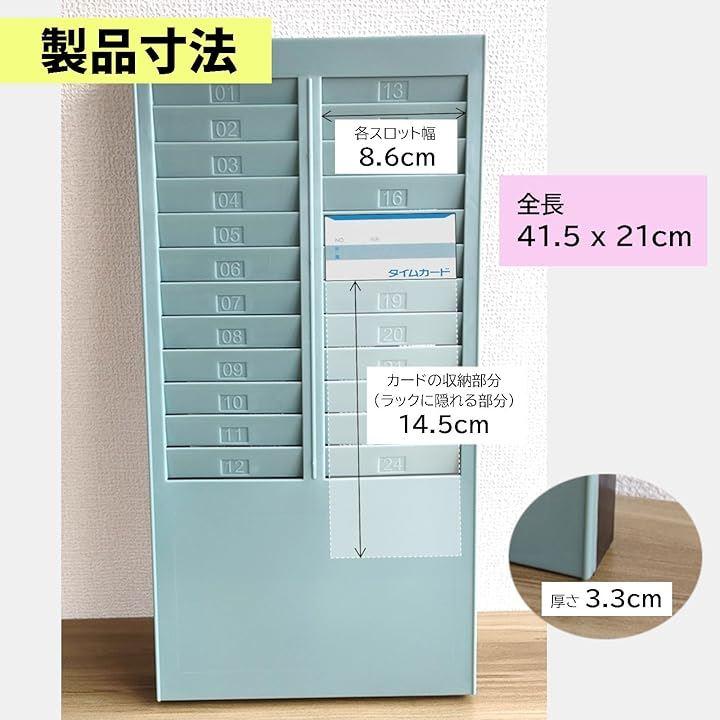 「大容量」24枚のカードが収納できるスロット付き。通常サイズのタイムカード(紙タイプ)を入れると、名前部分は重ならず見えやすい設計になっています。