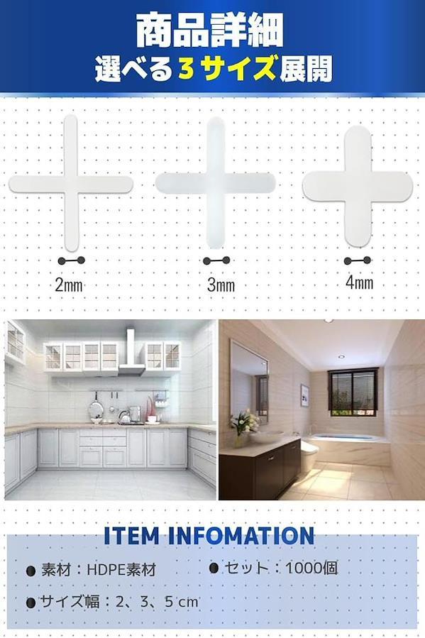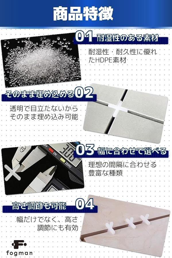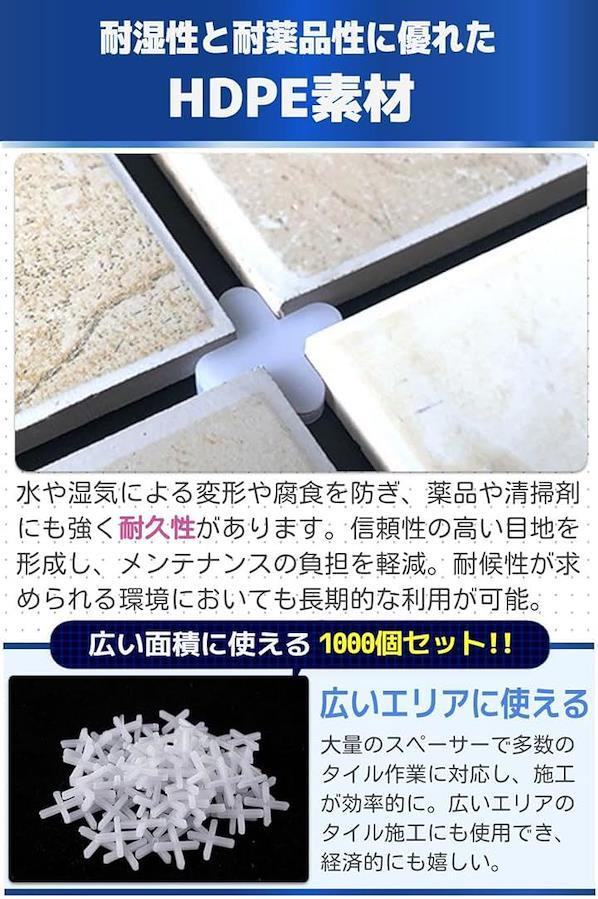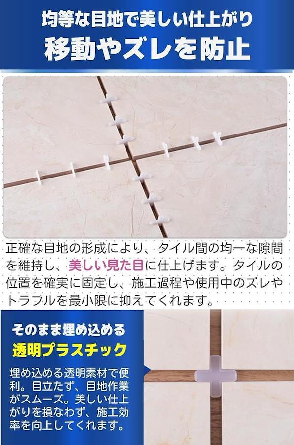 「商品特徴」耐湿性のある素材 (1)耐湿性・耐久性に優れたHDPE素材 :そのまま埋め込める /(2)透明で目立たないからそのまま埋め込み可能 :幅に合わせて選べる /(3)理想の間隔に合わせる :豊富な種類 /(4)高さ調節も可能 :幅だけでなく、高さ調節にも有効「商品詳細」セット:1000個 素材:HDPE素材/セット:1000個 /素材:HDPE素材