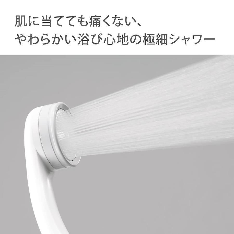水圧が低くてもシャワーに勢いをプラスすることができる節水低水圧タイプです。約0.3mmの細い水流と均等配列した高密度なやわらかい肌あたりで、頭全体をしっかりやさしく包みこむ水幅ワイドなシャワーです。