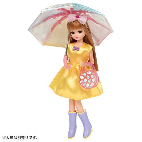 リカちゃんのカサと長靴、ミキマキちゃんの長靴、バッグのセットです。開閉するカサはリカちゃん、ミキマキちゃん両方に使えます。カラフルなの雨粒模様のついたポップなレイングッズです。
