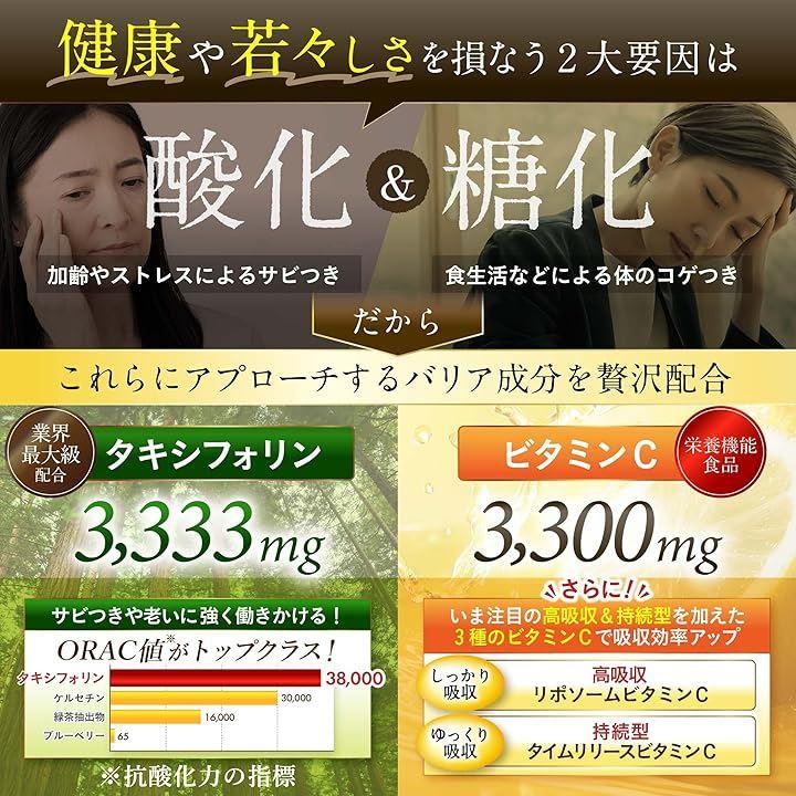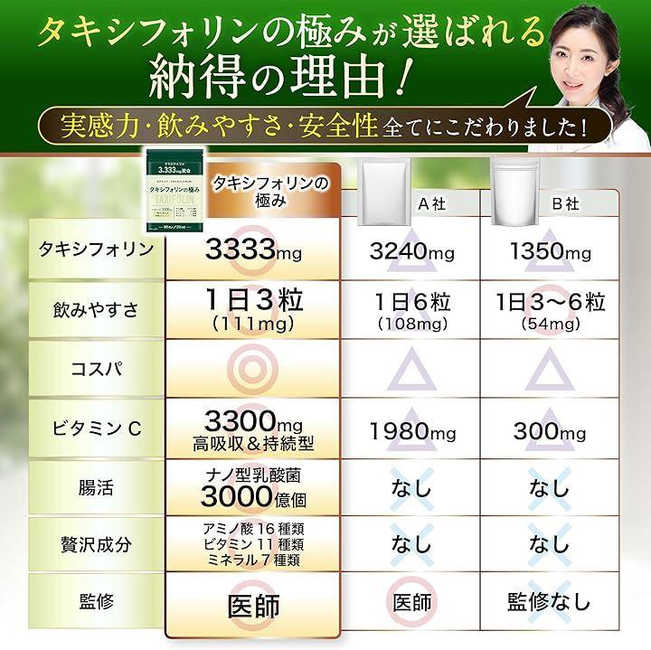 「国内トップクラスのタキシフォリン含有量」「「タキシフォリンの極み」は、1袋に3333mgのタキシフォリンを配合したサプリメントです(1日3粒で、タキシフォリン111mg配合)