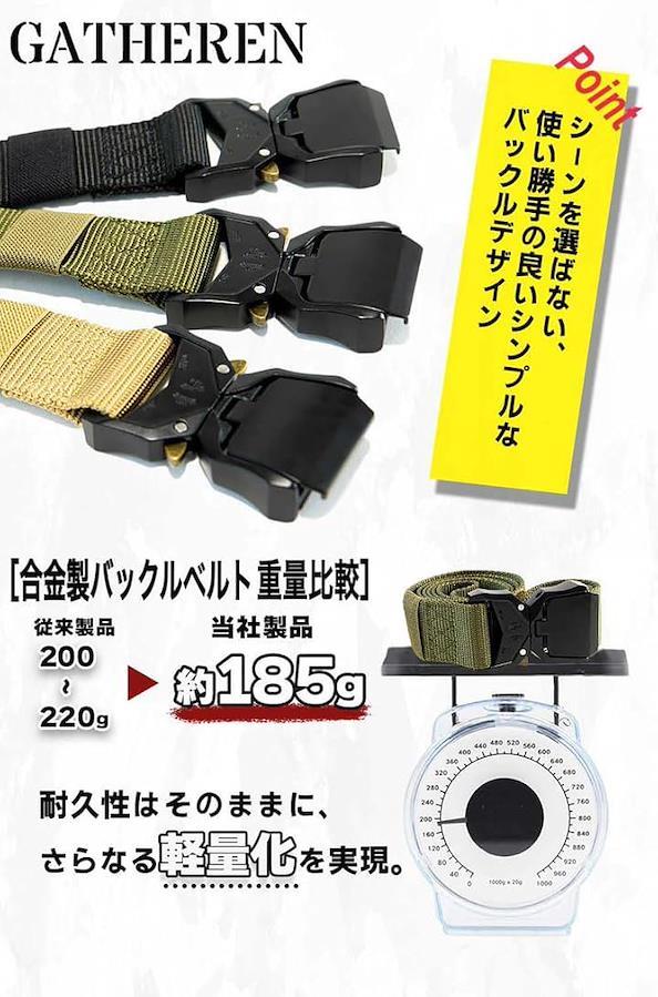 高耐久ナイロン素材にアルミ合金製バックルで丈夫でタフな作り。なのに軽量(約185g)。あらゆるシーンに最適なタクティカルベルト。
