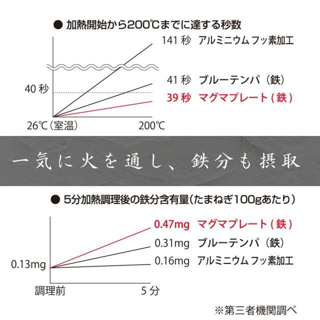 健康・美味しさにこだわる人が選ぶ日本製・鉄フライパン日本製の高品質鉄材使用。フライパンから手軽に鉄分摂取。強火でおいしく調理ができ、鉄ならではの耐久性。マグマプレートとは内側と外側の両面に細かな凹凸を付けた独自開発プレート。凹凸により表面積が広くなるので、熱伝導が良くなり食材の芯まで一気に火を通し、食材の旨味を閉じ込めることができます。さらに、フライパンからの鉄分溶出により食材と一緒に鉄分摂取ができます。また、凹凸を付けた表面加工により、油馴染みがよく、使っていくほどに焦げ付きにくくなります。