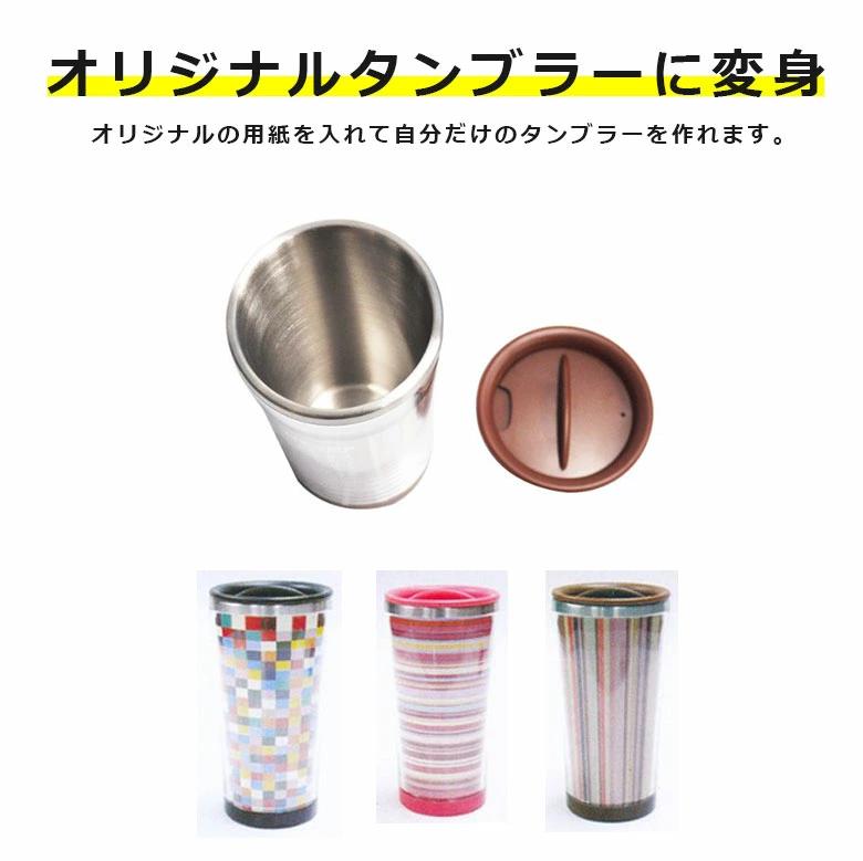 商品説明 | ●本体と外側の間にデザイン紙やお好きな絵などの紙を入れることができ、自分だけのオリジナルデザインタンブラーを作ることができる ●オールシーズン対応の蓋付マグカップ ●結露しにくい二重構造 ●ほこりが入らない蓋付、蓋のつまみを回せば蓋をしたまま飲むことができる ●オフィスやご家庭でも便利に使える ●冷たい飲み物から暖かい飲み物までオールシーズンで活躍する ●蓋はこぼれにくいパッキン付 ●マグボトルではないので横にして持ち運ぶことはできない |
