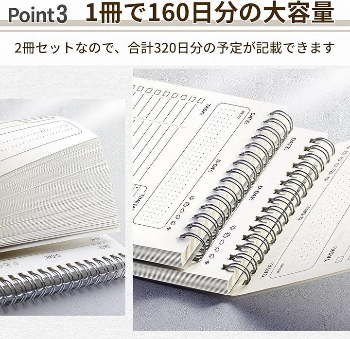 1冊あたり80ページ、合計160日分の予定やメモが記録できる大容量。