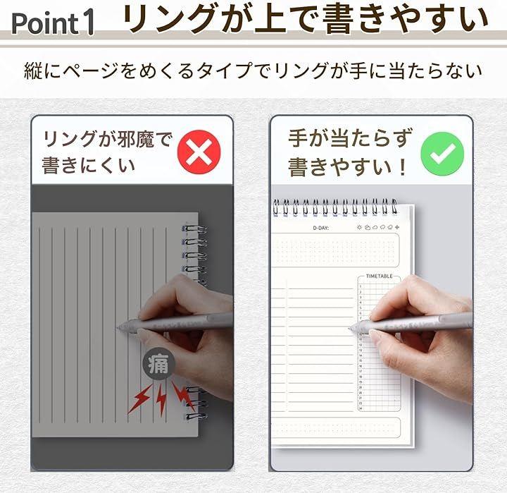 一般的な横綴じノートとは異なり、左右どちらの手でも書きやすく、作業や勉強の効率を損ないません。