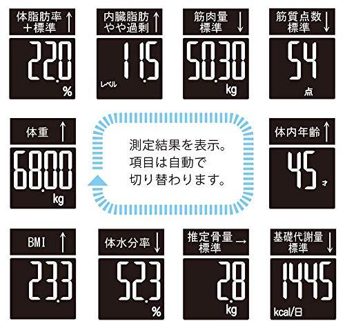 サイズ:約幅310×奥行274×高さ33mm電源:DC6V 単3乾電池×4本保証期間:1年間セット内容・付属品:本体、取扱説明書(保証書付き)、お試し用電池(単3形アルカリ乾電池×4本)最大計量:150kg最小表示:0~100kg/50g単位、100~150kg/100g単位体脂肪率:0.1%単位、体脂肪率判定(5段階判定、6才~)
