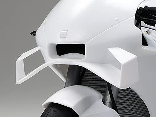 1/12スケールのプラスチックモデル組み立てキット。完成時サイズは全長178mm、全幅62mm、全高100mm。エンジン、スイングアーム、フロントフォーク、マフラーなどはビス止めによりフレームに固定。スライドマークは各種ロゴマークの他、No.36 ジョアン・ミル、No.42 アレックス・リンス、テストライダーのNo.50 シルバン・ギントーリのゼッケンナンバーを用意。カウルの塗り分け用マスクシールも付属。