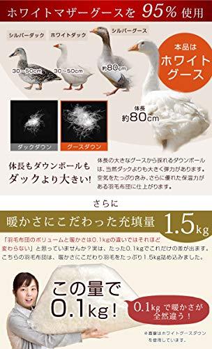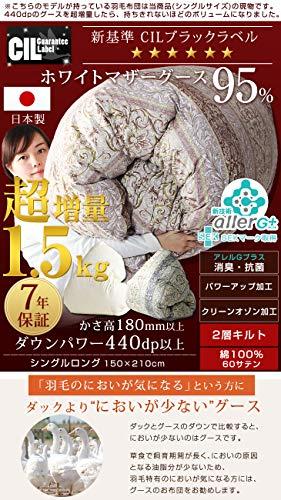 【サイズ】150x210cm(シングルロング) 【充填量】1.5kg 【重量】2.74kg 【ループ数】8ヶ所 【素材】側地:綿100%(超長綿60サテン) / 詰め物:ホワイトマザーグースダウン (ダウン95%、フェザー5%) 【生産国】日本(※羽毛の産地は東アジア(台湾・中国等)です。) 【カラー】ベージュ◆新基準CILブラックラベル獲得 -6つ星☆☆☆☆☆☆- ◆ CILブラックラベルは、日本で唯一の羽毛専門の公的検査研究機関である、快適睡眠環境研究所(CIL)が発行する品質ラベルで、かさ高180mm以上、ダウンパワー440dp以上の羽毛を使用した高品質な羽毛布団の証です。◆羽毛のにおいについて◆ 羽毛は天然素材のため、無臭ではございません。原毛は洗浄によりほとんど臭いを感じないようにはしておりますが、開梱直後や温度・湿度等の環境等により臭いを感じる場合がございますので、開封直後には風通しの良い場所での十分な陰干し等をお勧めいたします。なお、天然羽毛の臭いのため人体に害はございませんのでご安心ください。◆安心の7年保証◆ 正常な使用状況において、製造上の責任による損傷が発生した場合、購入から7年以内で修理・交換を致します。(当店で管理するお客様情報から照会させて頂きます。受注確認メールの保管をお願い致します。) ≪保証内容について≫ 1.製造上の責任による損傷が発生した場合 2.羽毛の吹き出し(但し、側地より、大きな羽毛が使用に耐えないほど大量に飛び出した場合に限ります。) 3.下記の場合は有効期間中であっても無償保証はできませんのでご注意ください。( A.誤った取り扱いによる損傷 B.不当な処理や改造をされた場合の損傷 C.火災等の天変地異による損傷 D.転居等の輸送で生じた損傷 E.保証書の紛失及び提示の無い場合 )※遠隔地からの修理につきましては、往復の送料を頂きます。◆おすすめポイント◆ ◎贅沢にふっかふかの羽毛大増量1.5kg! ◎6つ星 CILブラックラベル取得(かさ高180mm以上、ダウンパワー440dp以上) ◎安心の7年保証 ◎ホワイトマザーグース95% ◎丁寧に仕上げた日本製 ◎ほどよい光沢としなやかな肌触りの60サテン ◎羽毛をふっくら復元!国内パワーアップ加工! ◎SEK認定のアレルGプラスで消臭・抗菌効果が持続! ◎クリーンオゾン加工で除菌・防臭・防ダニ・防カビ 効果 ◎羽毛の飛び出しを防止するダウンプルーフ加工 ◎縫い目から暖かさを逃がさない二層キルト縫製