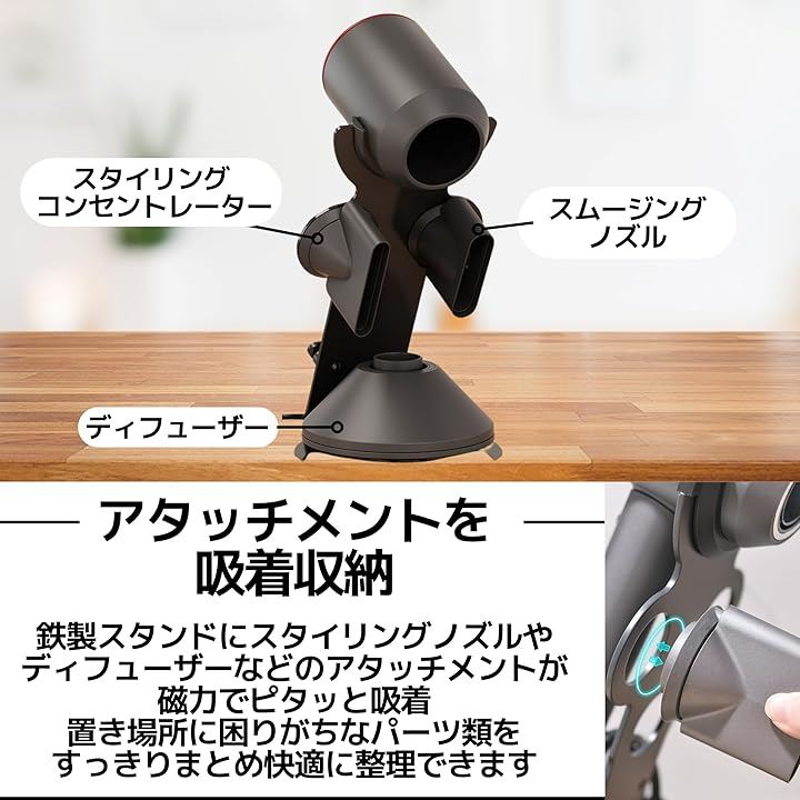 「アタッチメントを吸着収納」 鉄製スタンドに、スタイリングノズルやディフューザーなどのアタッチメントが磁力でピタッと吸着。