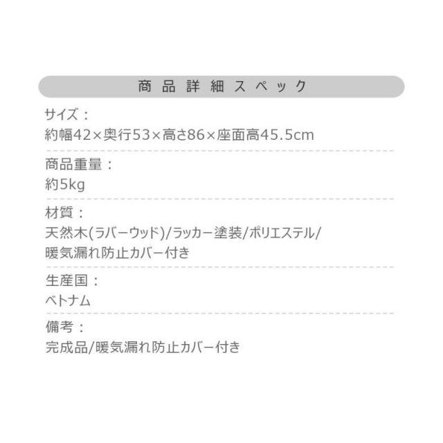 ●保温カバーは取り外し可能。●オフシーズンも通常のダイニングチェアとして使用できます。〈注意事項〉■こちらの商品は、北海道・沖縄・離島への配送は承っておりません。■こちらの商品は、完成品です。■お使いのモニターの発色具合によって、実際のものと色が異なる場合がございます。■万が一商品に不良・破損が生じていた場合は、商品到着後7日間以内にご連絡下さい。また、不具合箇所の画像添付をお願いします。■商品交換のための再梱包はお客様にてお願いいたします。商品の確認が済むまでは梱包材をお手元に残しておいて下さい。■在庫数は常に変動いたしておりますので、ご注文のタイミングによっては欠品となる場合がございます。大変ご迷惑をおかけいたしますが、何卒ご了承の程宜しくお願いいたします。