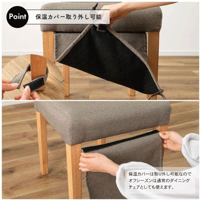 ●あたたかさが逃げないダイニングチェア。●こたつの暖気を逃がしにくい「暖気漏れ防止カバー付き」のダイニングチェア。●ダイニングこたつやデスクこたつに合わせるチェアとしておすすめ。
