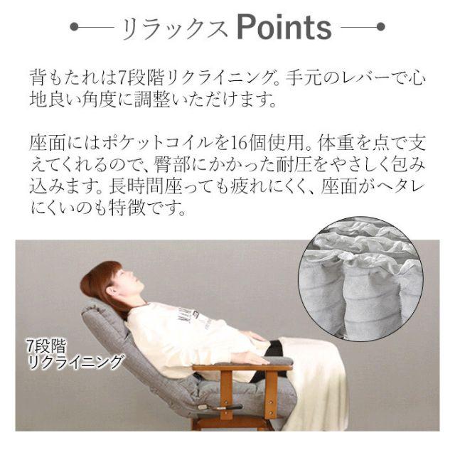 ◎ダイニングテーブルにも対応できる回転高座椅子です。・座面高は41・44cmの2段階に調整可能。ダイニングテーブルにも対応できる高さです。・手元のレバーで簡単に7段階のリクライニングができます。・360°回転するので椅子を動かすことなく向きを変えることができます。・座面にはポケットコイルを16個使用しており、臀部にかかった耐圧をやさしく包み込みます。・背もたれは前に折り込むことができコンパクトになります。・クッション付きの天然木の肘掛けが、立ち座りをサポートしてくれます。※組み立て式の商品になります。商品到着後はお客様ご自身で組み立てをお願いしております。(組立所要時間:約30分)【お手入れ方法】著しい汚れを落とす際は、ぬるま湯に市販の中性洗剤を3〜4%に薄め、柔らかい布で叩くように拭き取ってください。シンナー、アルコール、ベンジン等の有機溶剤は絶対に使用しないでください。変色や色落ち、品質の低下に繋がります。